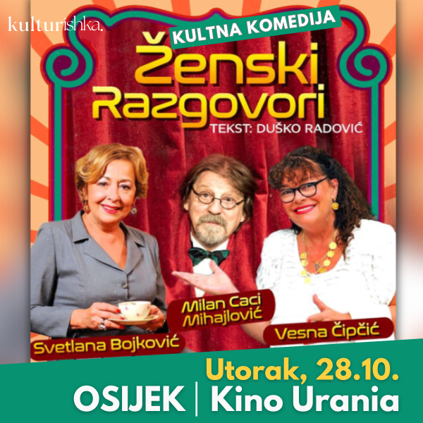 Tri velika glumačka imena — Svetlana Ceca Bojković, Vesna Čipčić i Milan Caci Mihailović — izvest će u utorak, 28.10. u Osijeku, u kinu Urania kultnu komediju Ženski razgovori, nastalu po tekstovima velikog Duška Radovića.